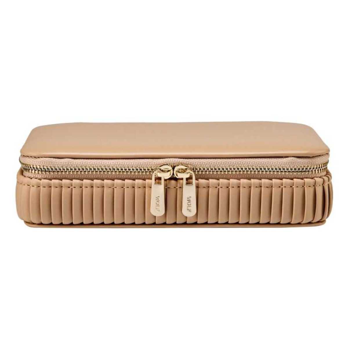 Bewaar uw favoriete juwelen stijlvol en veilig met het Bella Jewellery Zip Case. Dit elegante juwelenkistje straalt luxe en verfijning uit dankzij de zachte vegan buitenkant, de mooi geplooide zijkanten en de verfijnde goudkleurige details. Binnenin vindt u drie met LusterLoc™ gevoerde compartimenten die helpen om uw juwelen langer mooi te houden. Daarnaast zijn er twee ringrollen voor ringen of oorbellen en in het deksel twee extra elastische opbergvakjes voor kleinere sieraden. Compact, praktisch en elegant – het Bella Jewellery Zip Case is de perfecte manier om uw juwelen veilig te bewaren, zowel thuis als onderweg.