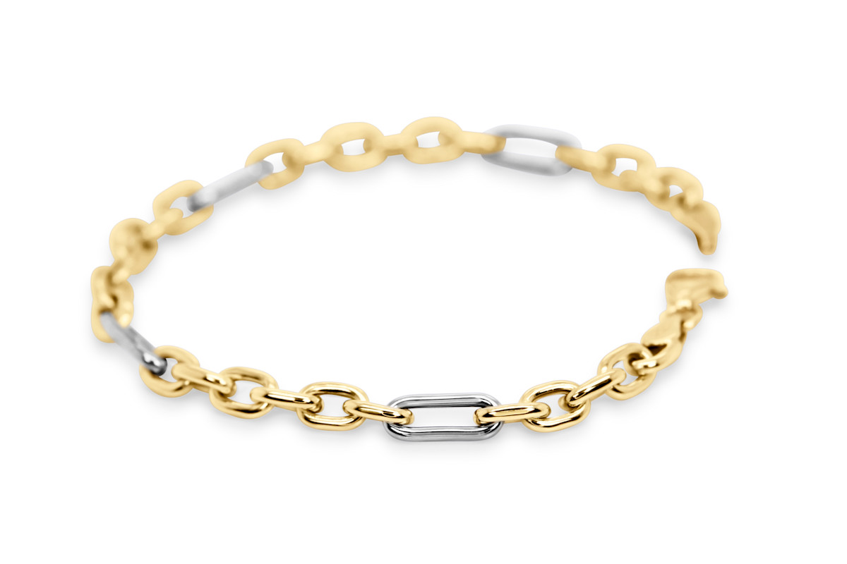 Schakelarmband in 14 kt wit en geel goud – hol uitgevoerd Deze stijlvolle schakelarmband is vervaardigd uit een combinatie van 14 kt wit en geel goud, wat zorgt voor een mooi contrast tussen warm en koel goud. Het klassieke ontwerp met afwisselende schakels geeft de armband een tijdloze uitstraling die zowel solo als in combinatie met andere juwelen prachtig tot zijn recht komt. De armband is hol uitgevoerd, waardoor ze opvallend is van look maar toch licht en comfortabel om te dragen. Ideaal voor wie houdt van een elegant juweel met volume, zonder zwaar aan te voelen rond de pols.