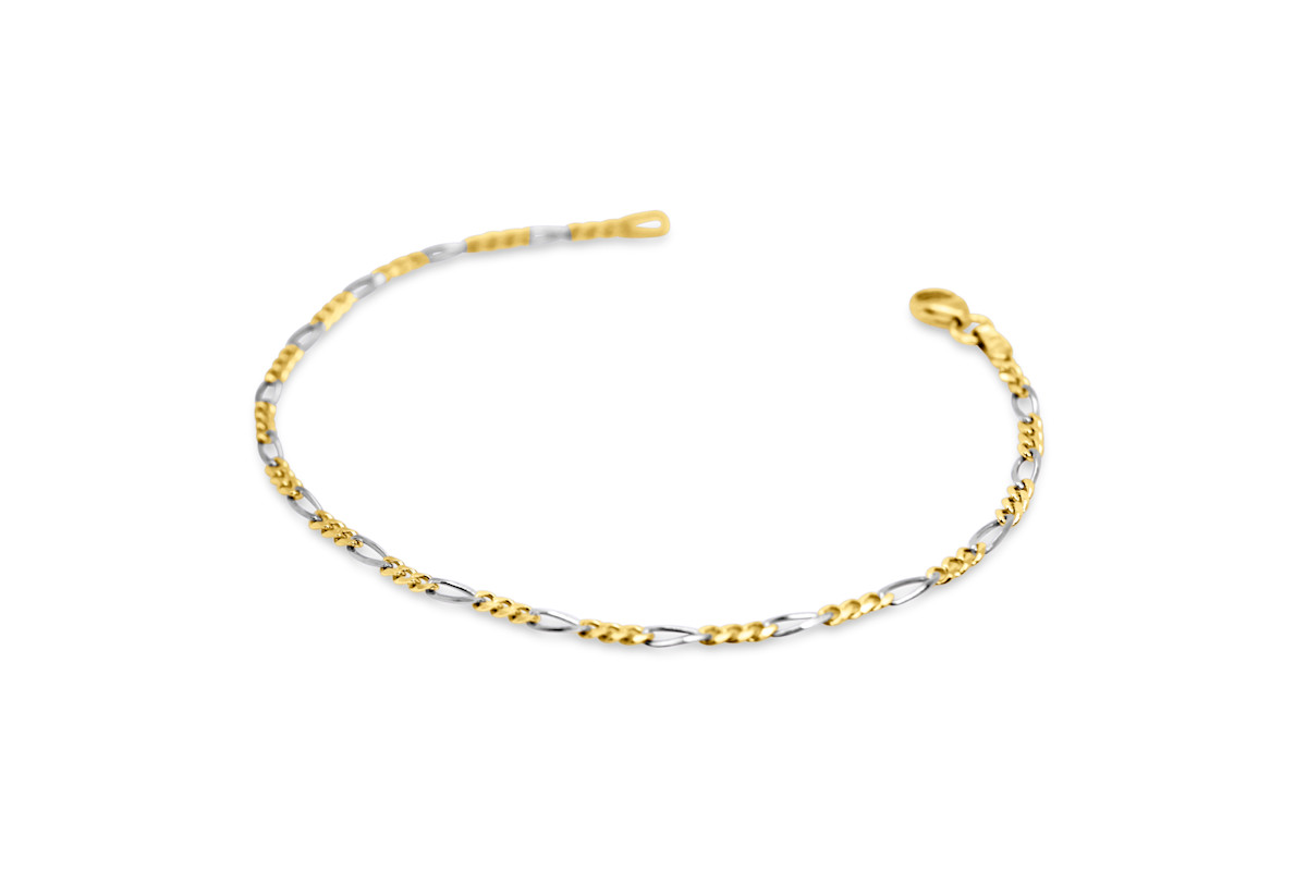 Armband met figaro schakel in 18 kt wit en geel goud Deze elegante armband in figaro schakel is vervaardigd uit een combinatie van 18 kt wit en geel goud. De afwisseling van de twee goudkleuren geeft het klassieke ontwerp een moderne en verfijnde uitstraling. De figaro schakel, herkenbaar aan het ritme van korte en langere schakels, zorgt voor een tijdloze look die zowel stijlvol als comfortabel is om te dragen. Dankzij het subtiele contrast tussen het koele witgoud en het warme geelgoud past deze armband moeiteloos bij andere juwelen in beide tinten.