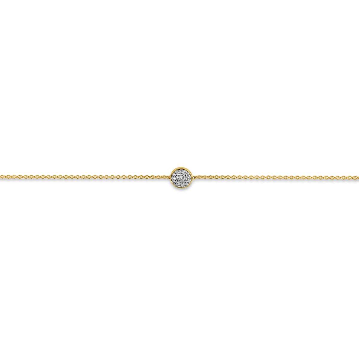 Fijn armbandje in 18 kt geel goud met briljanten schijfje – subtiele schittering, tijdloze charme Dit delicate armbandje in 18 karaat geel goud is een elegant sieraad met een minimalistische uitstraling en een fonkelend detail. In het midden prijkt een plat schijfje, volledig bezet met fijne briljantjes, die het licht op een subtiele maar sprankelende manier vangen. Dankzij het verfijnde ontwerp is dit juweel perfect voor dagelijks gebruik en laat het zich moeiteloos combineren met andere armbandjes of horloges. Het warme geel goud in combinatie met de schittering van de diamanten maakt dit armbandje tot een subtiel luxeaccent op elke pols. Een stijlvol detail dat elegantie uitstraalt in zijn eenvoud – voor wie houdt van pure klasse met een zachte fonkeling.