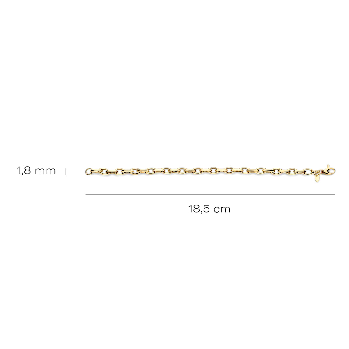 Ontdek deze schitterende 14k geelgouden schakelarmband van 18.5 cm. De jasseron schakels, met een robuuste materiaaldikte van 1.8 mm, creëren een tijdloze uitstraling. Deze armband voegt een klassiek, maar toch modern accent toe aan jouw look. Perfect om te dragen of cadeau te geven! Type goud: 14k Geel goud Type Schakel: Jasseron schakel Sluiting: Karabijnsluiting Diameter: ? 1.8 mm Omvang: 18.5 cm