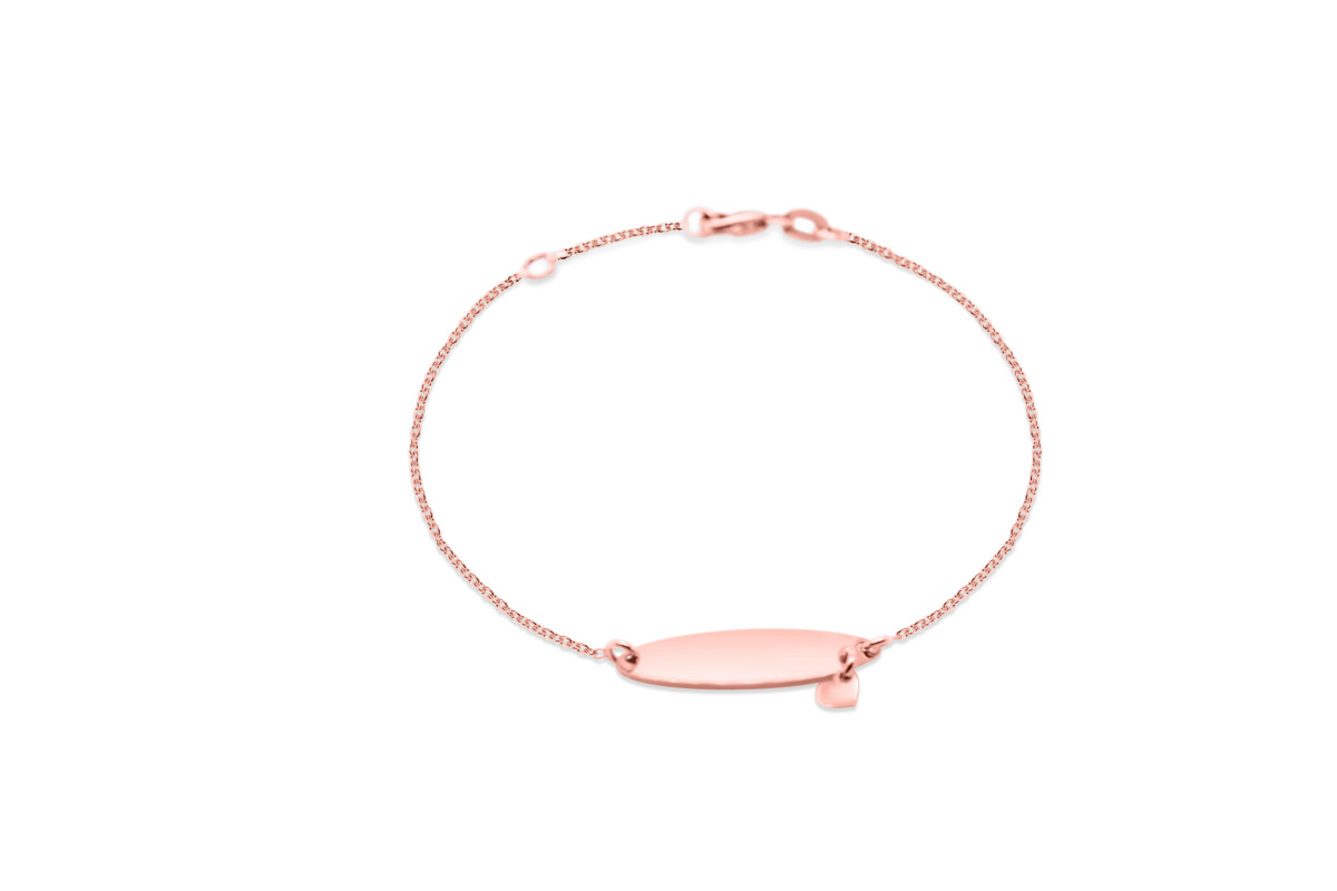 Armband in 18kt rood goud met een ovaal graveerplaatje waar een subtiel hartje aan hangt. In het plaatje zelf kan een naam gegraveerd worden. De armband is 19cm lang met een tussenoog op 17.5cm