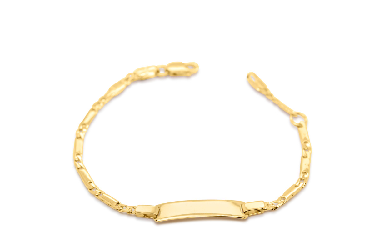 Babynaamplaatje in 9kt geel goud op 14cm lengte met een tussenoogje op 12.5cm.