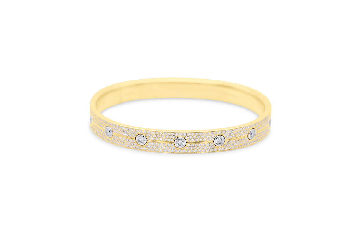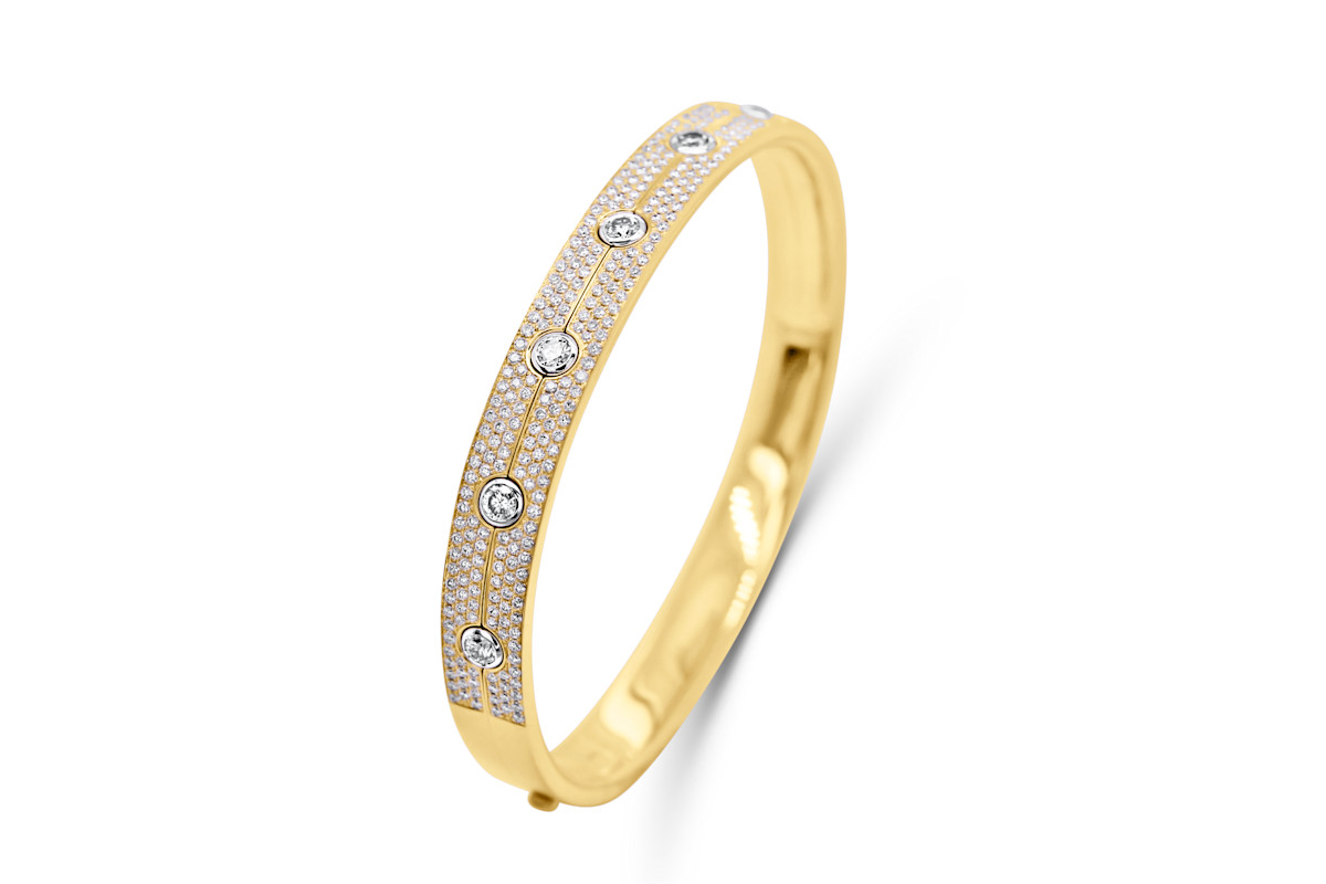 Deze bangle-armband in 18 karaat goud is een waar meesterwerk van elegantie en vakmanschap. Volledig bezet met briljantgeslepen diamanten, straalt dit juweel in elke beweging — een fonkelend lint van licht rond de pols. De perfecte plaatsing van elke steen zorgt voor een uniforme, continue schittering die zowel subtiel als indrukwekkend is. Een tijdloos sieraad dat kracht en verfijning uitstraalt — ontworpen voor wie durft te schitteren, elke dag opnieuw.