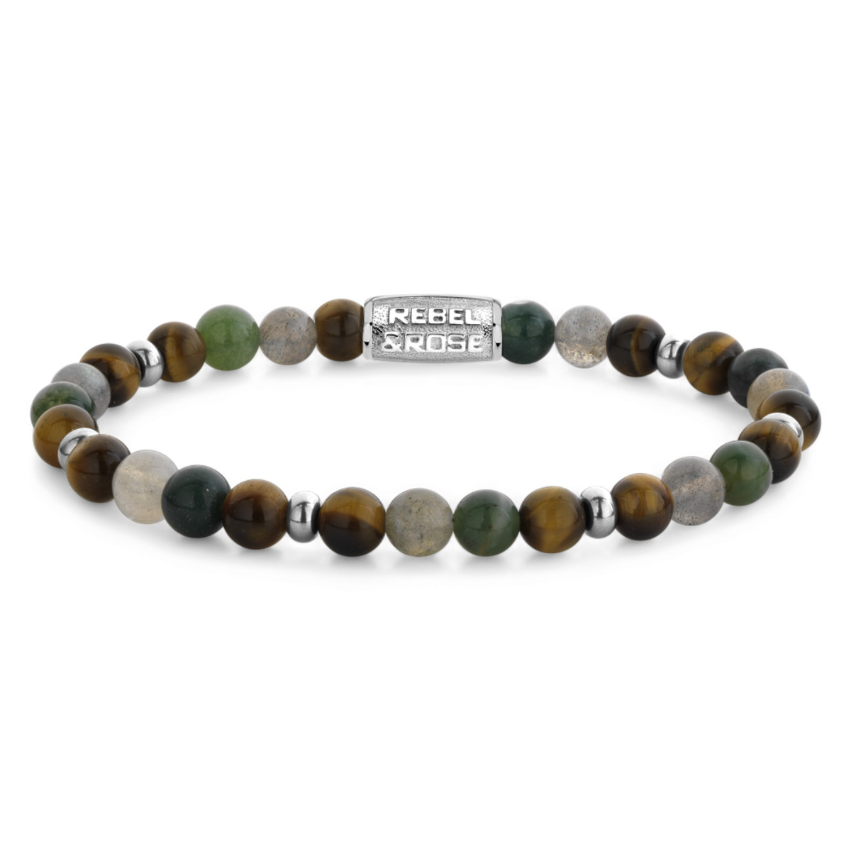 Bead armband, handgemaakt van 8mm stenen (Tijgeroog, Agaat, Labradoriet en kleine Stainless Steel elementen) met een zilverkleurige sluiting. De Rebel & Rose sieraden zijn makkelijk te combineren met andere zilveren, leren of kralenarmbanden.
