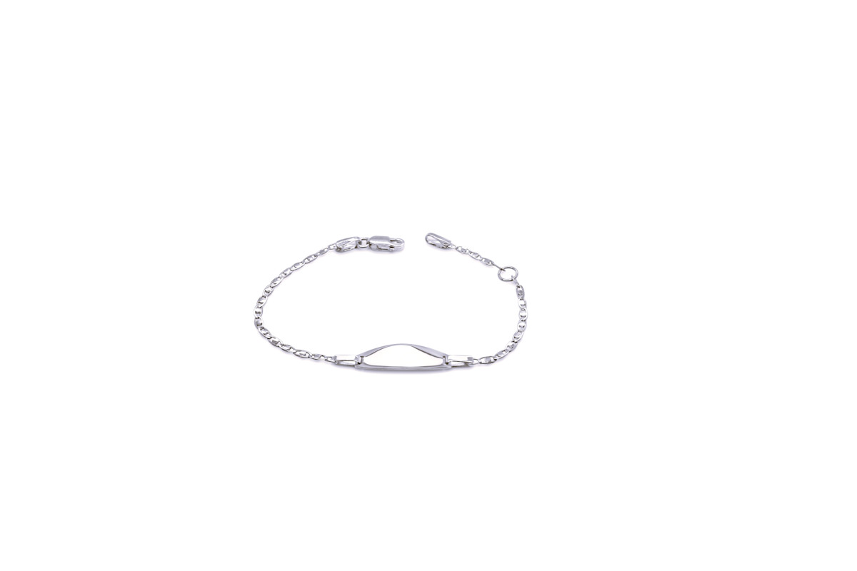 Babynaamplaatje in 9kt wit goud met een ovalen plaatje. De armband is 14cm lang met een tussenoog op 12cm.