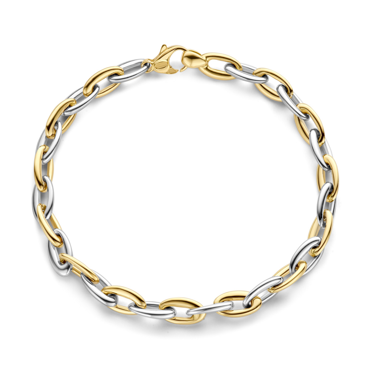 Schakelarmband in 18 kt wit en geel goud – harmonie in contrast Deze stijlvolle schakelarmband speelt met contrast en balans. Het ontwerp bestaat uit afwisselend witgouden en geelgouden schakels, wat zorgt voor een speels maar verfijnd lijnenspel. De combinatie van de warme gloed van geel goud en de koele elegantie van wit goud geeft dit juweel een tijdloze en veelzijdige uitstraling. Elke schakel is vakkundig afgewerkt voor een soepele pasvorm rond de pols en een luxueus draagcomfort. Ideaal om solo te dragen als statement piece, maar ook prachtig te combineren met andere gouden juwelen. Een armband die verfijning en karakter samenbrengt – voor wie houdt van elegante eenvoud met een speels accent.