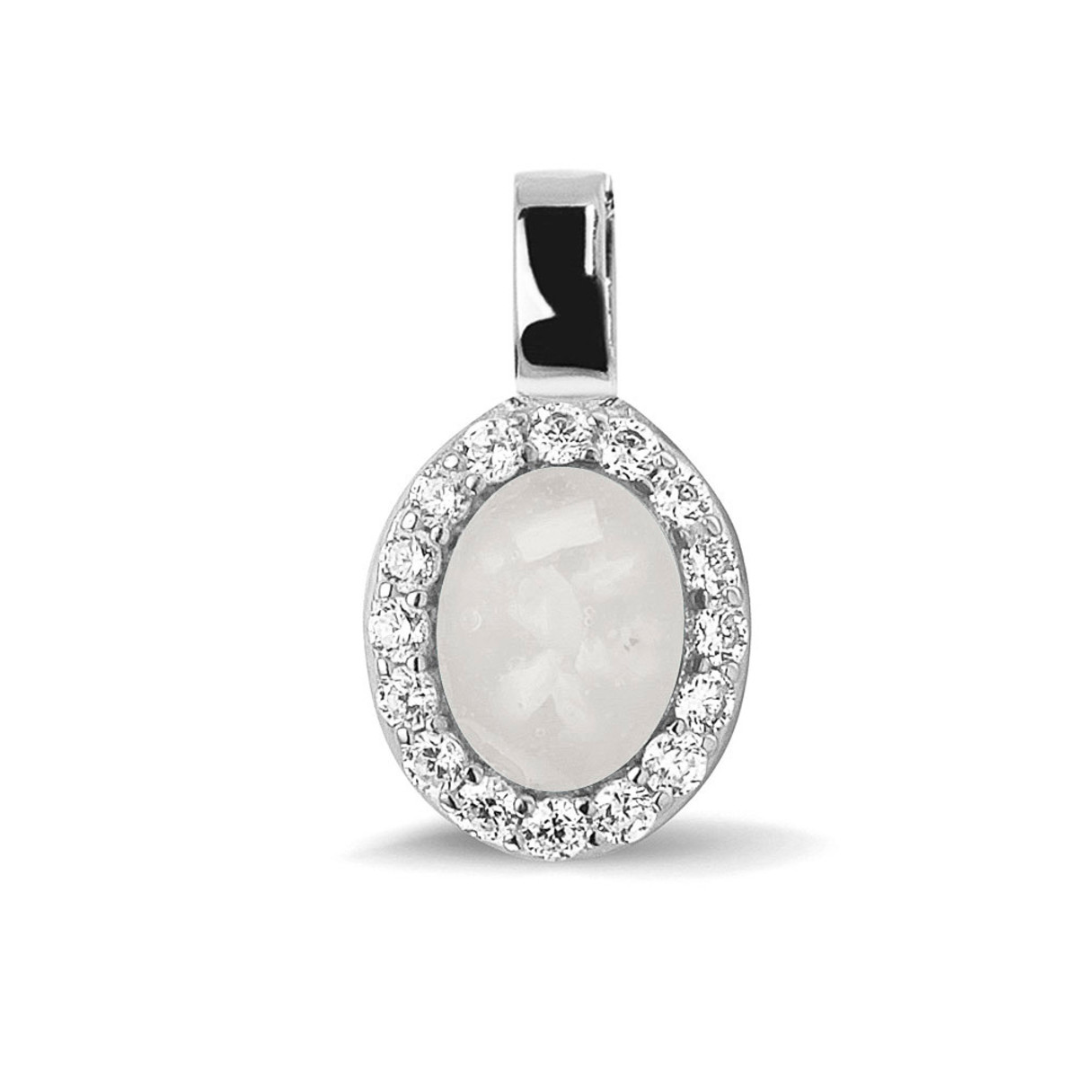 Hanger in zilver met zirkoniumsteentjes, de hanger is ongeveer 1.9cm groot.