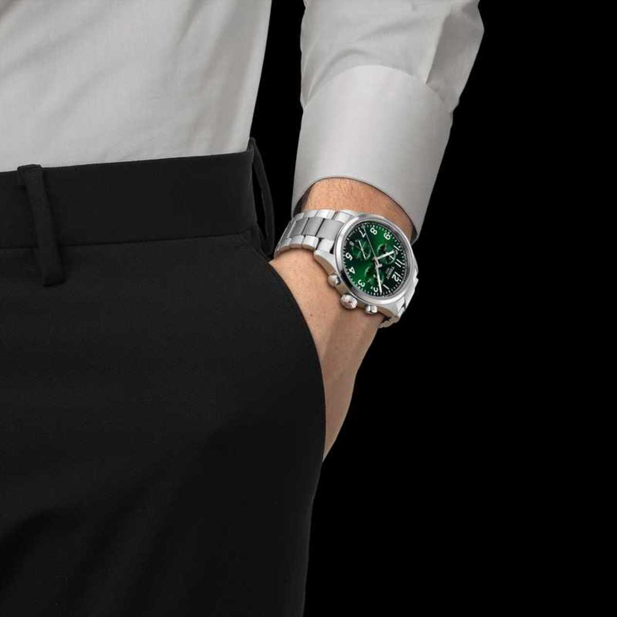 De Tissot T116.417.11.092.00 is een moderne en sportieve chronograaf die onmiddellijk opvalt door zijn stijlvolle groene wijzerplaat en robuuste uitstraling. Dit model uit de Chrono L-collectie combineert hedendaags design met de betrouwbaarheid van Zwitserse horlogemakerij. De diepe groene wijzerplaat in combinatie met de stalen kast en band geeft het horloge een krachtige maar verfijnde look. De duidelijke chronograaftellers en goed leesbare indexen zorgen voor een optimale afleesbaarheid in elke situatie. Met een kastdiameter van 42 mm heeft het horloge een perfecte balans tussen sportief en elegant. Het horloge is uitgerust met een Zwitsers quartz uurwerk dat garant staat voor precisie en gebruiksgemak. Het krasbestendige saffierglas met antireflecterende coating beschermt de wijzerplaat en zorgt voor een heldere weergave. Daarnaast is het horloge waterbestendig tot 100 meter, wat het geschikt maakt voor dagelijks gebruik en actieve momenten. De massieve roestvrijstalen band met handige snelsluiting geeft extra comfort en maakt het horloge veelzijdig draagbaar, zowel casual als gekleed. De Tissot T116.417.11.092.00 is de ideale keuze voor de man die op zoek is naar een sportief horloge met een unieke kleur en een sterke uitstraling, zonder in te boeten op kwaliteit en betrouwbaarheid.