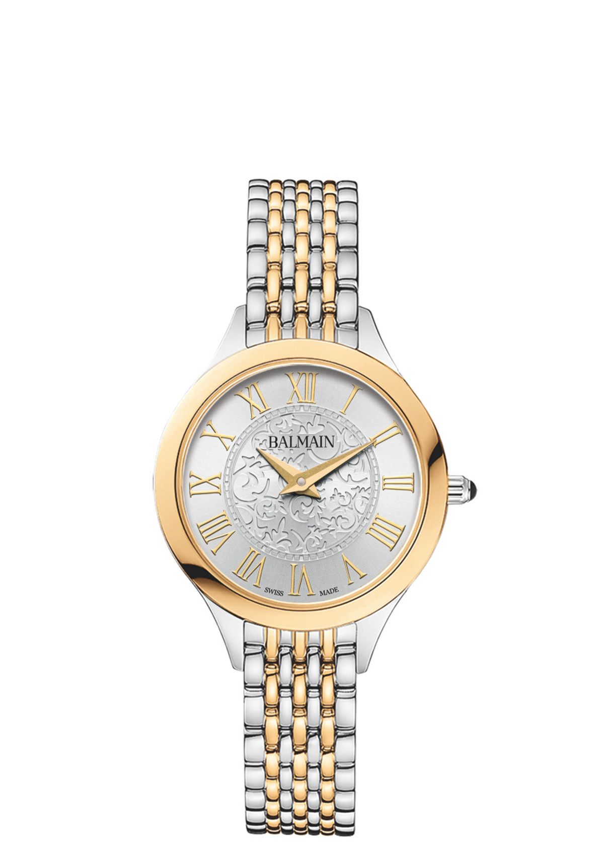 De Balmain de Balmain is een verfijnd dameshorloge dat stralende elegantie combineert met een modern design, geïnspireerd op de Parijse haute couture. De wijzerplaat met witte arabesken en klassieke Romeinse cijfers straalt zachte charme uit, terwijl de bicolor kast van roestvrij staal en geelgoud PVD (29 mm diameter en een elegante dikte van 6 mm), samen met de bijpassende armband, zorgt voor een gracieuze uitstraling voor elke dag. Dit Swiss Made horloge is uitgerust met een saffierglas.