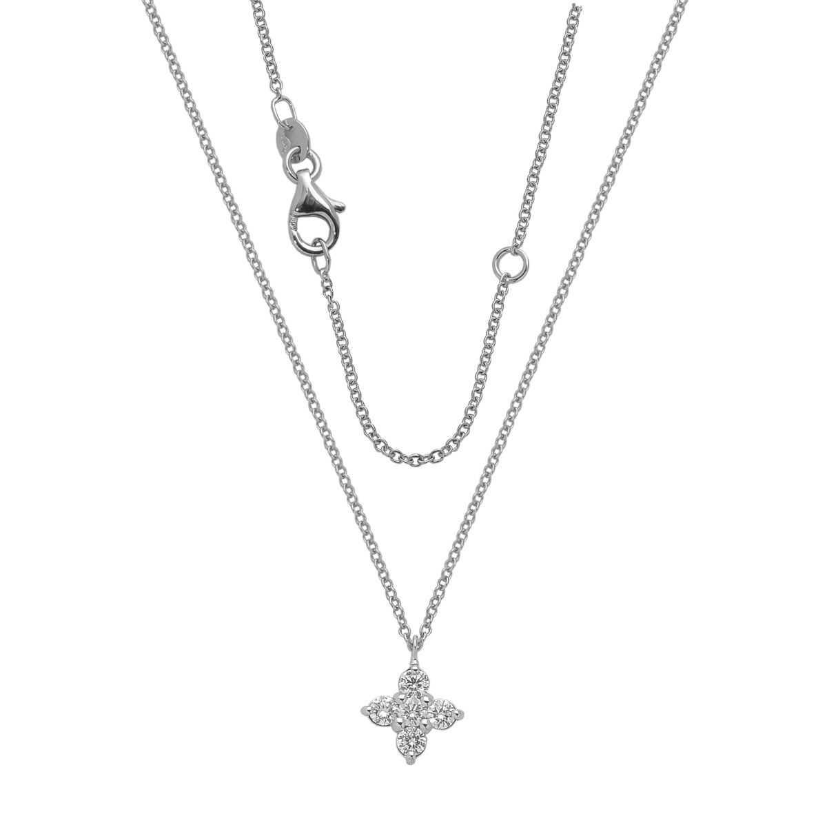 Halsketting met hanger in 18kt wit goud met briljant. De ketting is 42cm lang en er is een tussenoog op 38cm. zodat dit kort tegen hals gedragen kan worden.