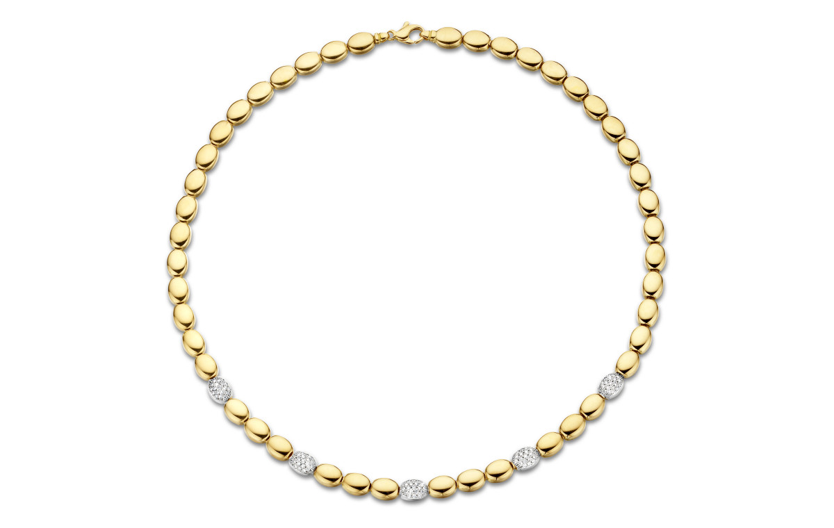 Collier in 18kt wit en geel goud met briljant, doorheen de collier zijn er 5 schakels waarin er in wit goud briljant gezet is. De collier is 45cm lang.