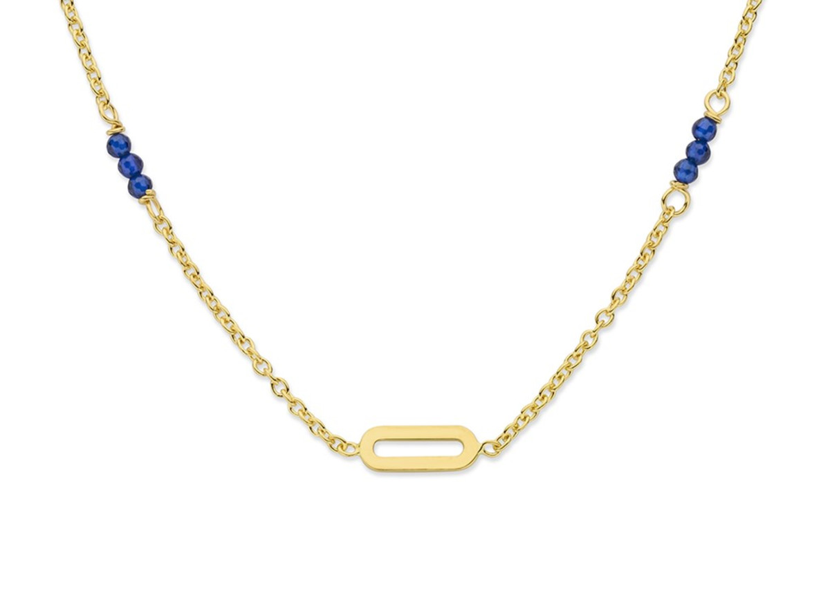 Halsketting in 18kt geel goud met blauwe saffiertjes, de ketting is42cm lang en ook de bijpassende armband en oorhangers zijn verkrijgbaar.