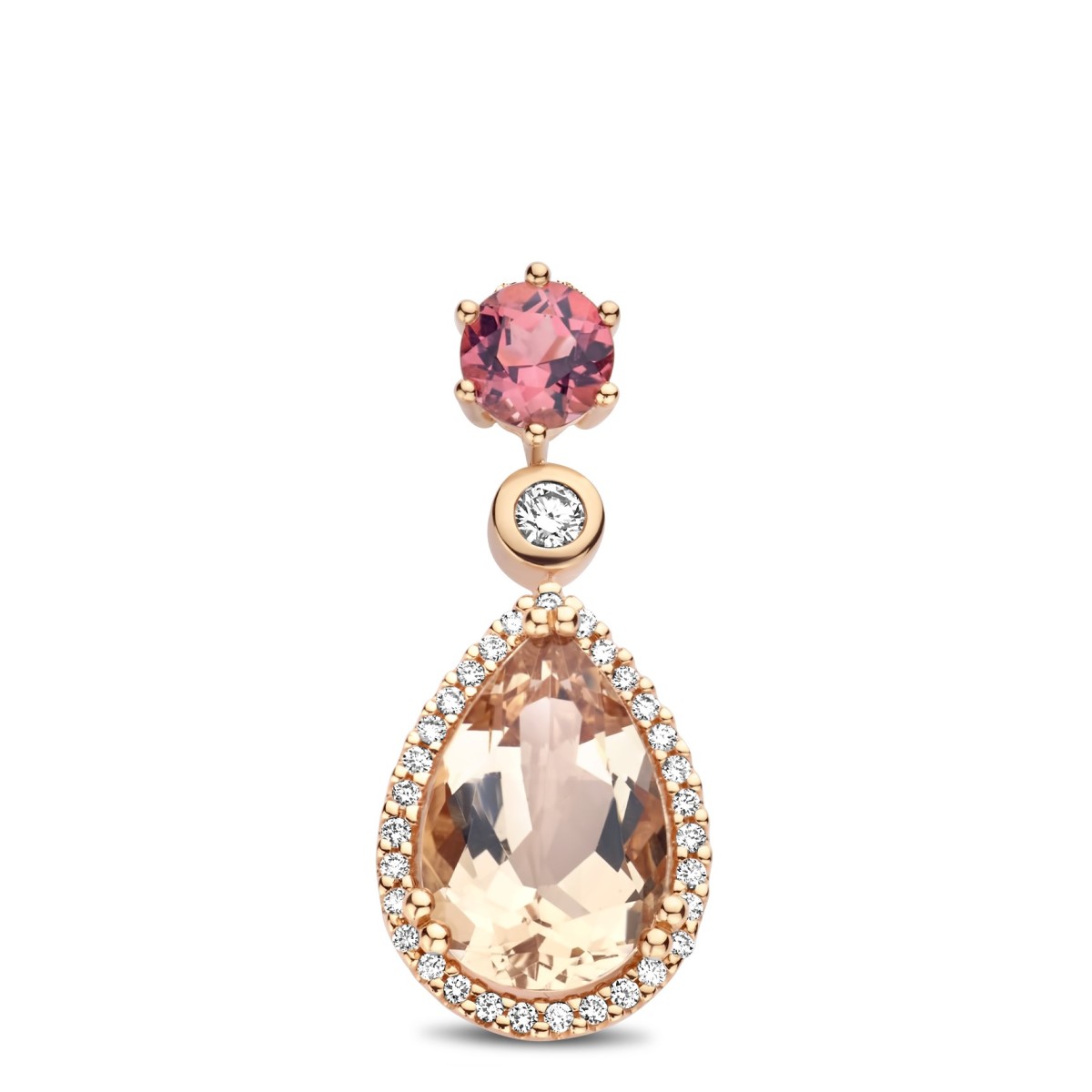 Hanger in 18kt rood goud met briljant, morganiet en toermalijn. De hanger is ongeveer 2.5cm lang. Ook de bijpassende oorhangers zijn verkrijgbaar.