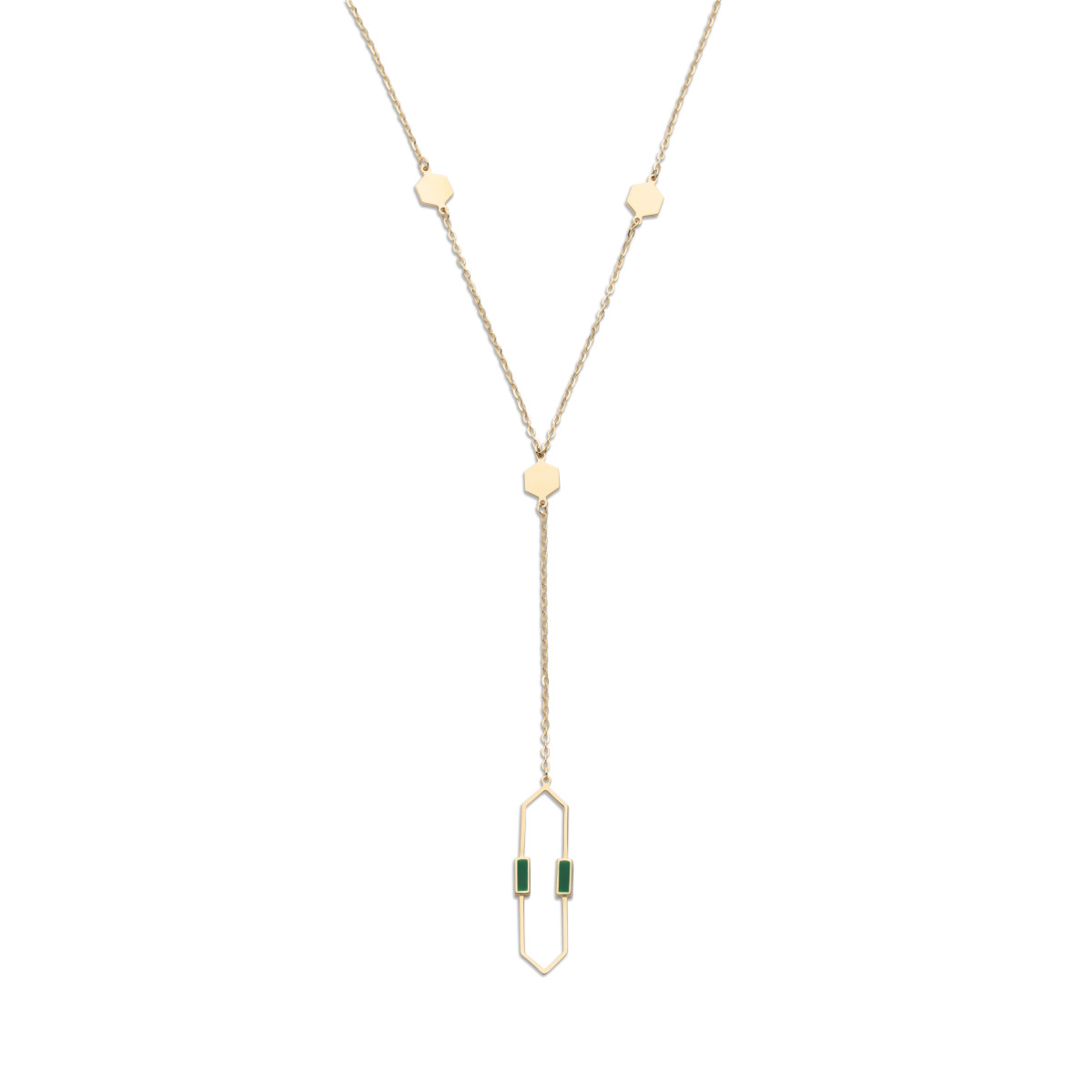 Halsketting in 14kt geel goud met groene emaille, de ketting is 52.5cm lang met een oogje op 51cm en op 49.5cm. Het hangende gedeelte is 11cm lang. Ook de bijpassende oorhangers, armbanden en ringen zijn verkrijgbaar.
