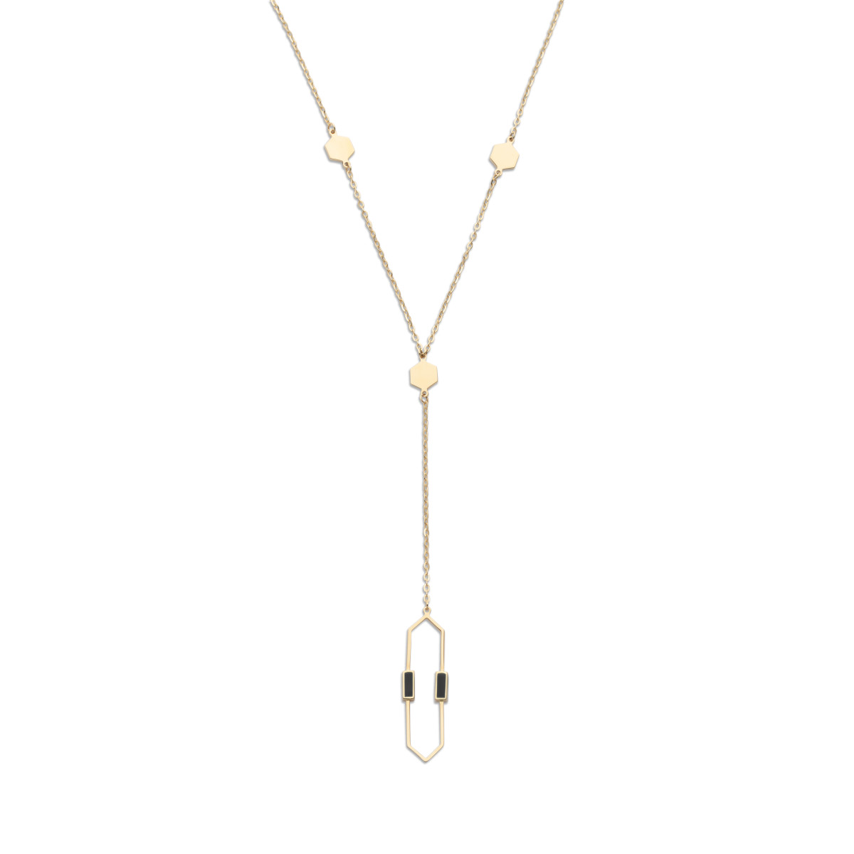 Halsketting in 14kt geel goud met zwarte emaille, de ketting is 52.5cm lang met een oogje op 51cm en op 49.5cm. Het hangende gedeelte is 11cm lang. Ook de bijpassende oorhangers, armbanden en ringen zijn verkrijgbaar.