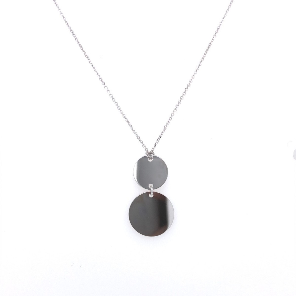 Halsketting met 2 ronde plaatjes waar er iets op gegraveerd kan worden. De ketting is 44cm lang met een tussenoogje op 41cm. Het bovenste rondje heeft een diameter van 1cm en het onderste van 1.4cm.