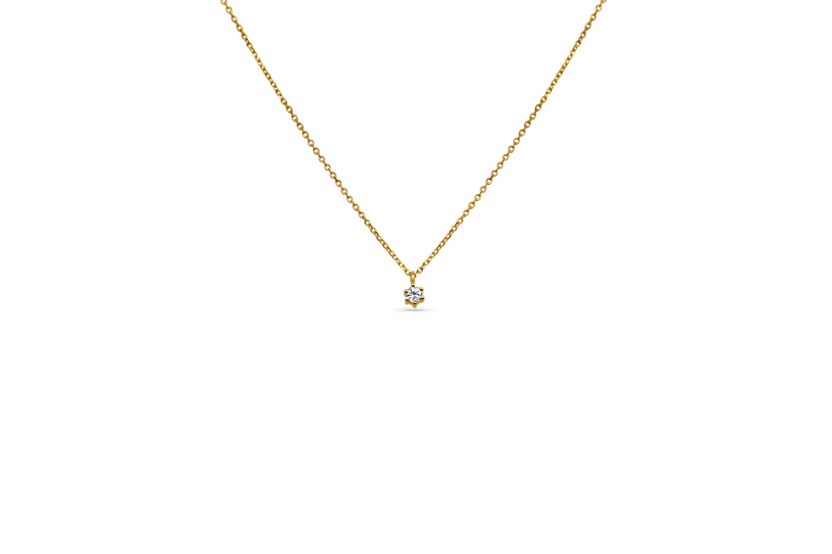 Halsketting in 14kt geel goud met een klein potje met 6 griffen waar 1 zirkoniumsteentje in gezet is. De halsketting is 45cm lang met een tussenoog op 42cm.