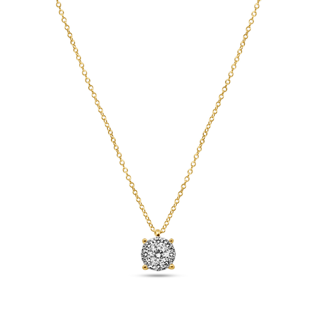 Fijne halsketting met clusterhanger in 18 kt goud en briljanten Deze elegante halsketting in fijne rolloschakel is uitgevoerd in 18 kt goud en afgewerkt met een subtiele hanger bezet met meerdere kleine briljanten. De briljanten zijn nauwgezet in een clusterzetting geplaatst, waardoor ze samen de illusie wekken van één grotere centrale steen. Het resultaat is een tijdloze, verfijnde look met een opvallende schittering, zonder te overdrijven. Perfect om dagelijks te dragen of als subtiel accent bij een feestelijke outfit. De halsketting is 45cm lang met een tussenoog op 43.5cm en op 42cm lengte.