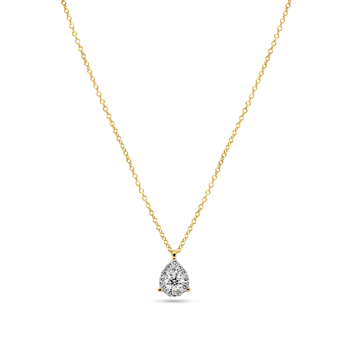 Fijne halsketting met druppelvormige clusterhanger in 18 kt goud en briljanten Deze verfijnde halsketting in fijne rolloschakel is vervaardigd in 18 kt goud en afgewerkt met een elegante druppelvormige hanger. De hanger is bezet met meerdere kleine natuurlijke briljanten, zorgvuldig geplaatst in een clusterzetting die samen het effect geeft van één grotere steen in de vorm van een druppel. De combinatie van de organische vorm en het schitterende lichtspel maakt dit juweel bijzonder stijlvol en vrouwelijk. De look is tegelijk tijdloos en subtiel opvallend – ideaal voor dagelijks gebruik of als verfijnd accent bij een geklede outfit. De halsketting is 45cm lang met een tussenoog op 43.5cm en op 42cm lengte