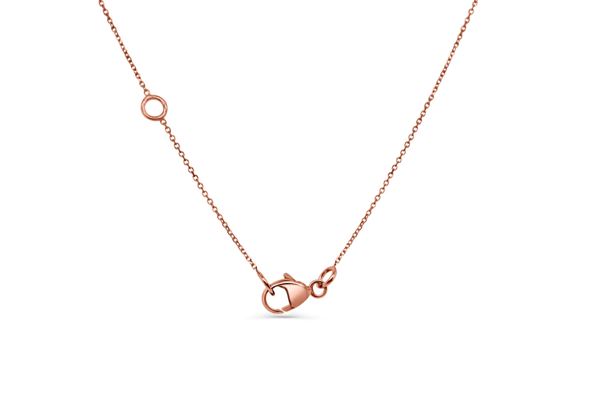 Halsketting in 18kt rood goud met een 1 briljantje dat gezet is in een potje met 4 griffen. De halsketting is 45cm lang met een tussenoog op 42cm.