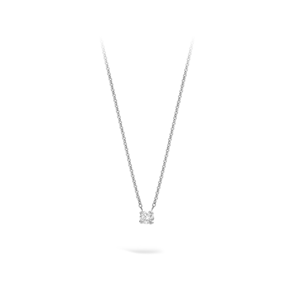 Subtiele elegante halsketting in 18kt wit goud meet 1 briljantje dat vast tussen de halsketting zit. De ketting is 43cm lang en heeft een veilig cartierslotje. De briljant is0.14ct groot en is gezet in een wit gouden potje met 4 griffen.