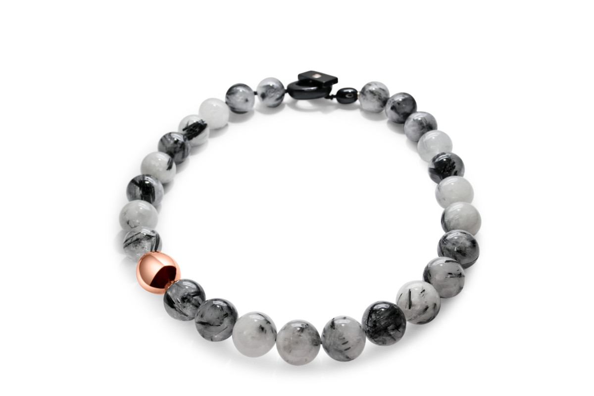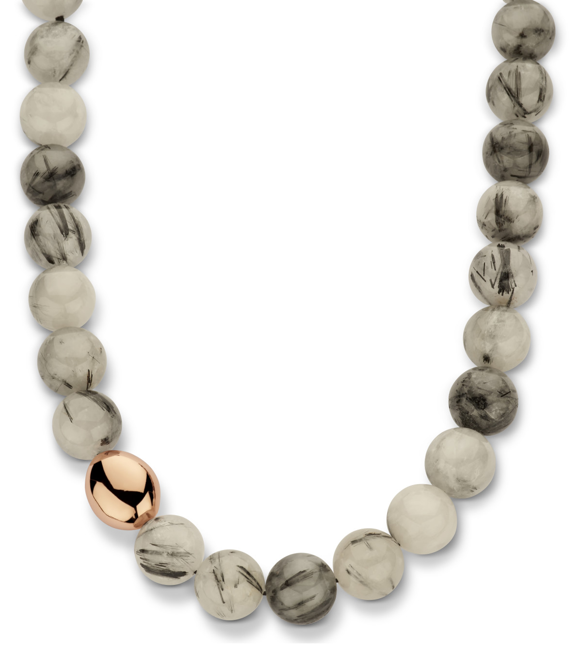 Prachtige collier met toermalijn quartz, de collier is 48cm lang, heeft tussen de quartz bollen 1 ovalen rood gouden detail. Ook de bijpassende armband is verkrijgbaar om het geheel compleet te maken.