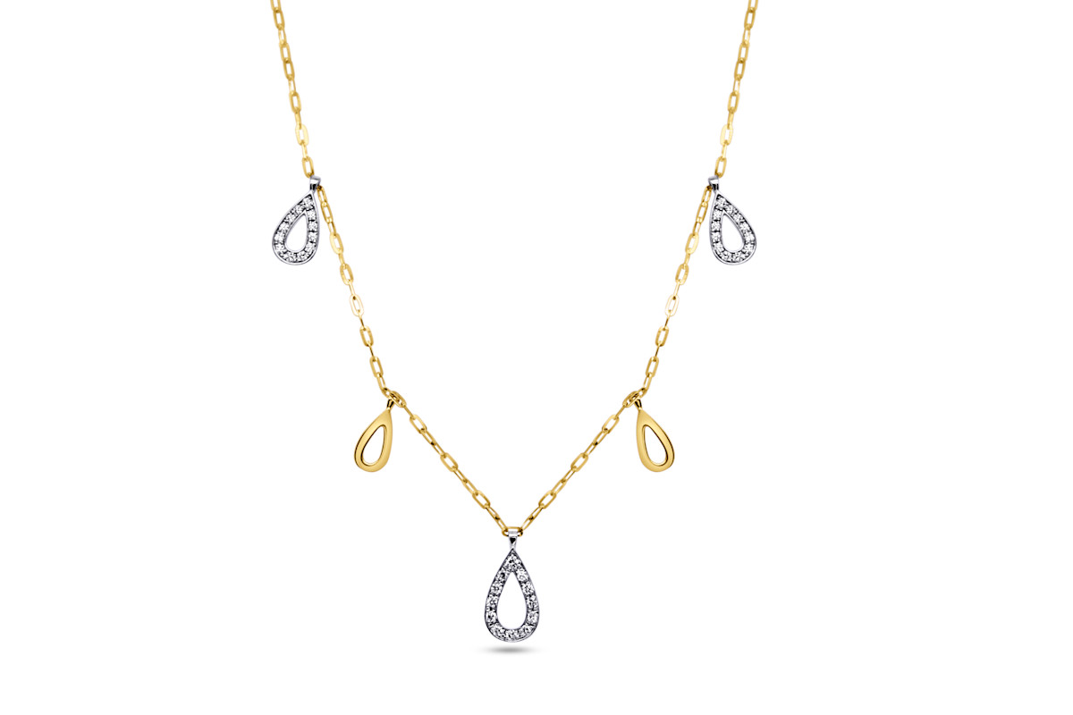 Deze verfijnde halsketting in 18 karaat goud speelt op een subtiele manier met ritme en contrast. Vijf druppelvormige hangertjes — afwisselend in wit en geel goud, met en zonder briljant — bewegen elegant mee met elke beweging. De afwisseling van kleur en schittering zorgt voor een levendig spel van licht, zonder opdringerig te zijn. Een juweel dat pure elegantie uitstraalt, met oog voor detail en evenwicht. Perfect voor wie houdt van verfijnde luxe met een speels accent. De halsketting is 42cm lang.
