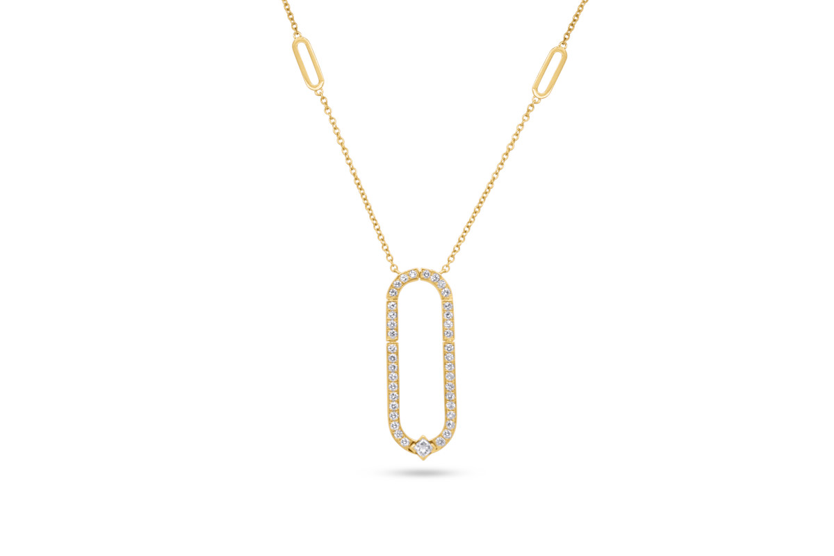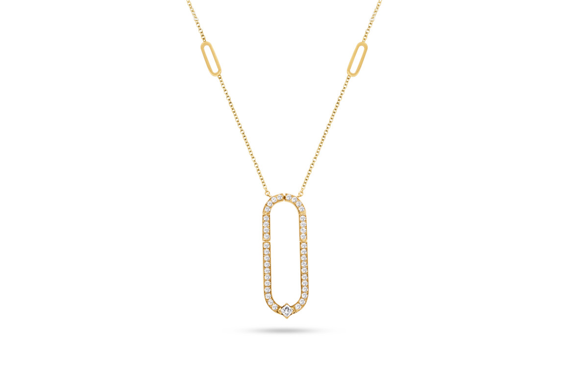 Halsketting met hanger in 18kt geel goud, de halsketting is 47cm lang. De hanger is ovaal van vorm en bezet met briljant en 1 princess, de hanger hangt vast tussen de ketting.