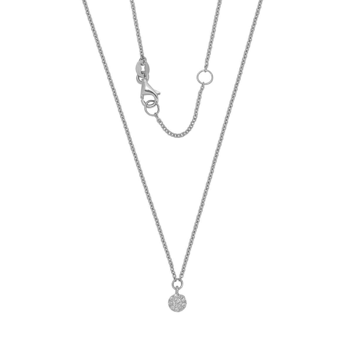 Halsketting met hanger in 18kt wit goud met briljant. De ketting 45cm lang met een tussenoog op 42cm. Het hangertje is elegant en heeft een diameter van ongeveer 4.5mm. Kan perfect apart gedragen worden maar kan ook gecombineerd worden met een andere halsketting.