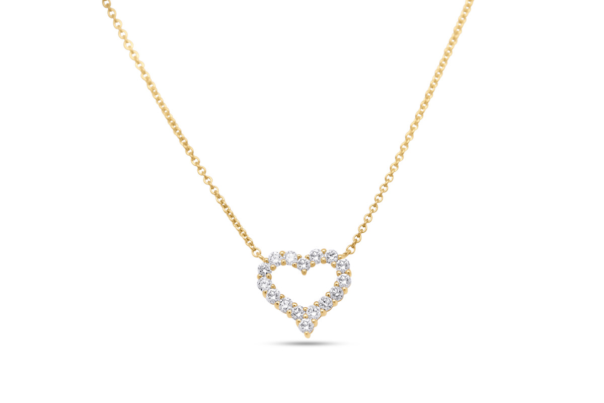 Halsketting in 18kt geel goud met een hartje in briljant, de halsketting is 45cm lang met een tussenoog op 42.5cm en op 40cm. Het hartje is 1.1cm breed en 1.1cm hoog.