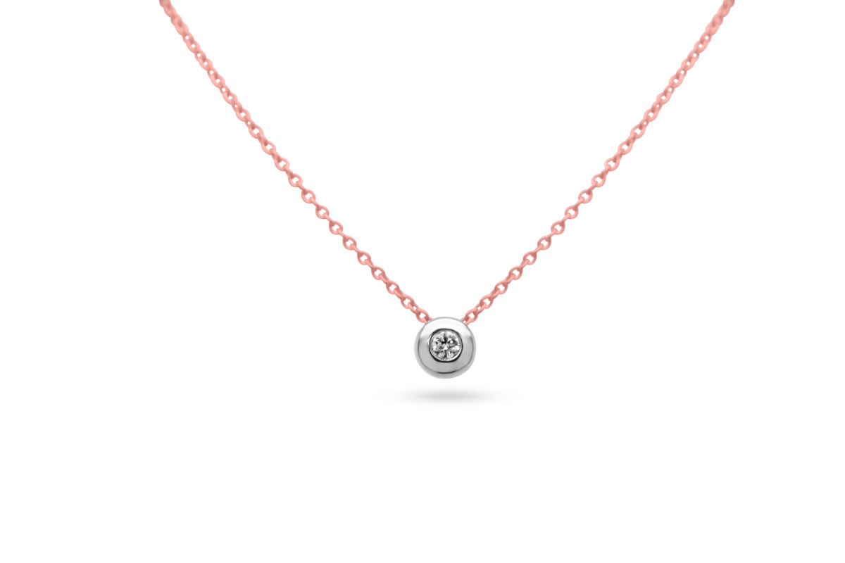 Halsketting in 18kt rood goud met een rond wit gouden potje met 1 briljantje van 0.08ct. De halsketting is 45cm lang met een tussenoog op 42cm.