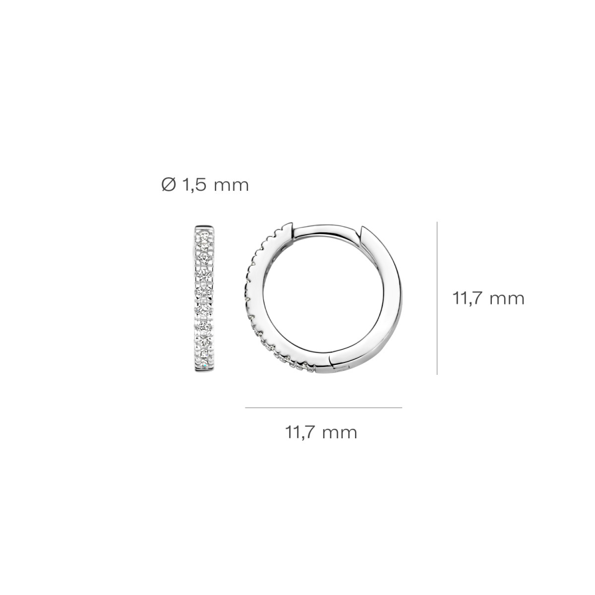 Alle sieraden van Blush zijn met aandacht en liefde gemaakt van 14k goud - geel, ros? of wit. Hoge kwaliteit waarvan je jarenlang plezier hebt staat bij ons voorop net als de mogelijkheid om eindeloos te mixen en te matchen. Een sieraad van Blush is een cadeau voor jezelf of een ander en komt daarom altijd in een cadeauverpakking. Diameter: ? 1.5 mm Lengte: 11.7 mm Type goud: 14k Wit goud Type sluiting: Kliksluiting Type steen: Zirkonia Zetting: Pave zetting