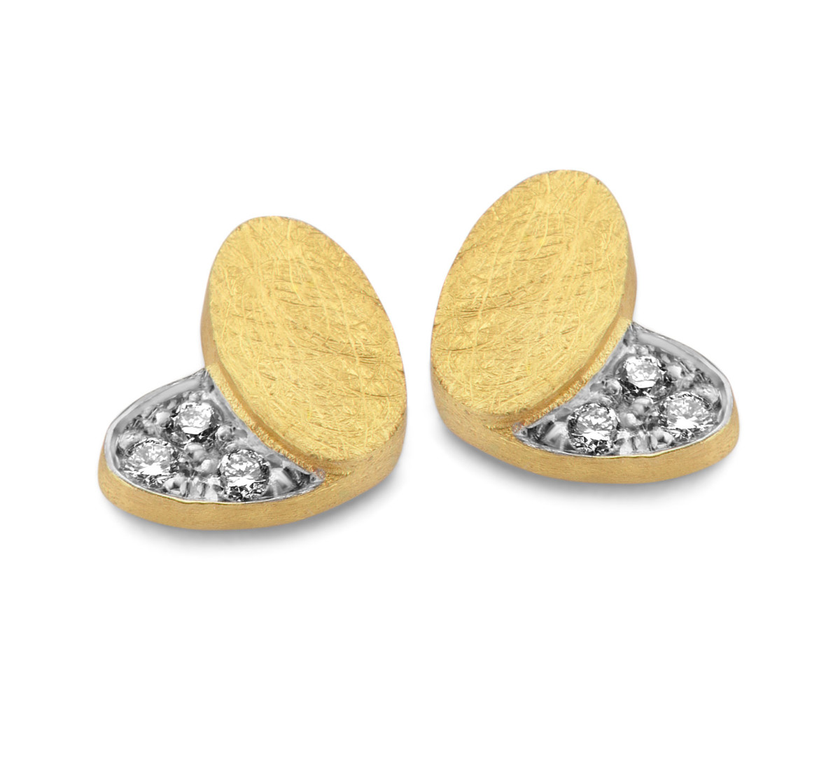 Oorknoppen in de vorm van een subtiel hartje in wit en mat geel goud met briljant.