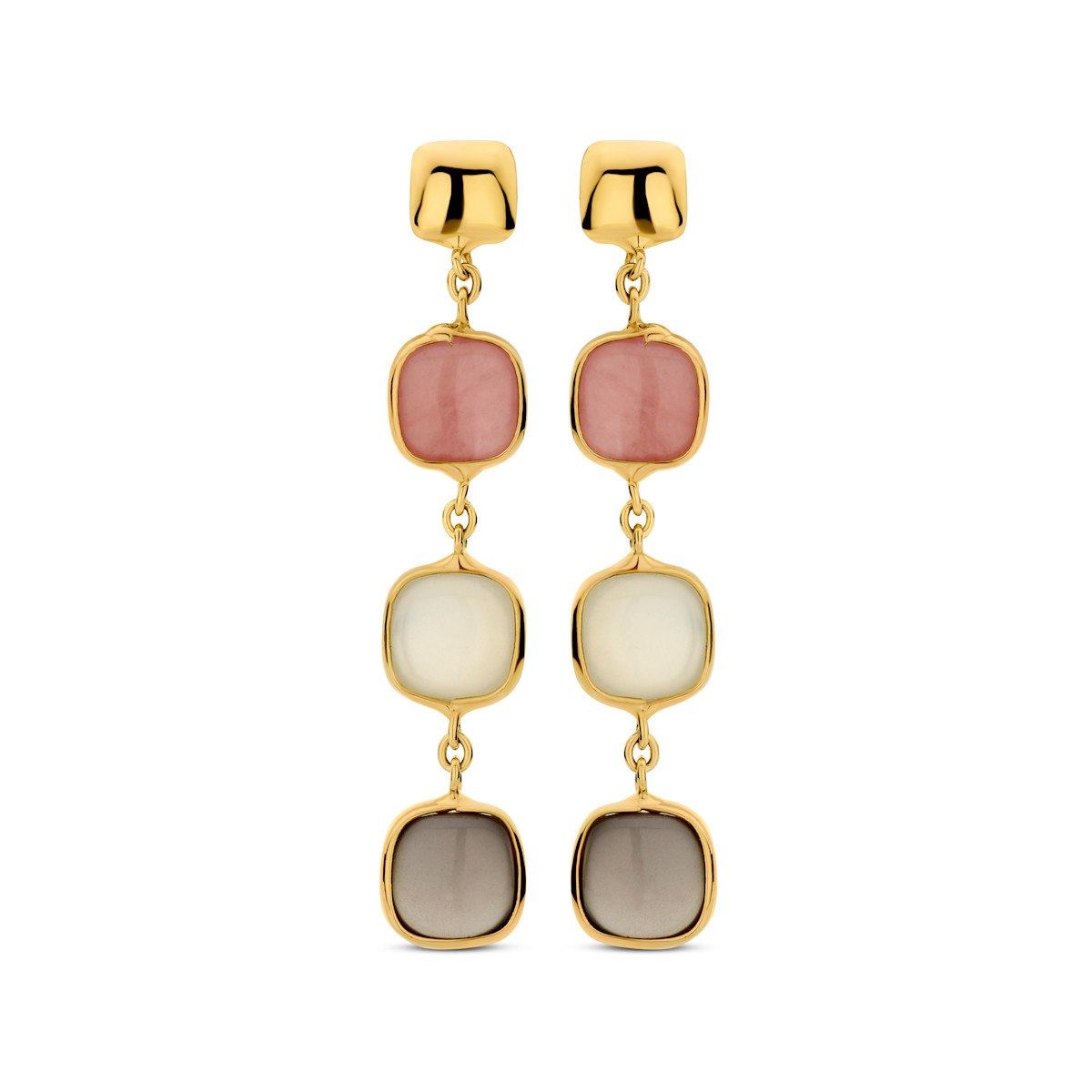 Deze oorhangers van 3 cm lang combineren verfijning met een subtiele speelsheid. De zachte beweging van de oorhangers en de cabochons in delicate kleurtinten zorgen voor een elegante en vrouwelijke uitstraling. Dankzij hun fijne afwerking en lichtheid zijn ze aangenaam om te dragen, zowel overdag als bij een avondlook. Een stijlvol juweel dat opvalt door zijn eenvoud en kleurharmonie. Ook verkrijgbaar met de bijpassende halsketting en armband voor wie houdt van een mooi afgestemde set.