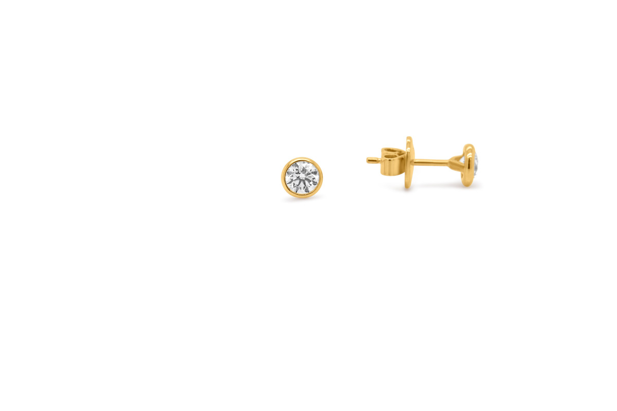 Oorknop in 18kt geel goud met briljant, de oorknop heeft aan elke zijde een 0.25ct briljant die gezet is in een rond potje. De oorring heeft een diameter van 5 mm en is afgewerkt met een poussette.