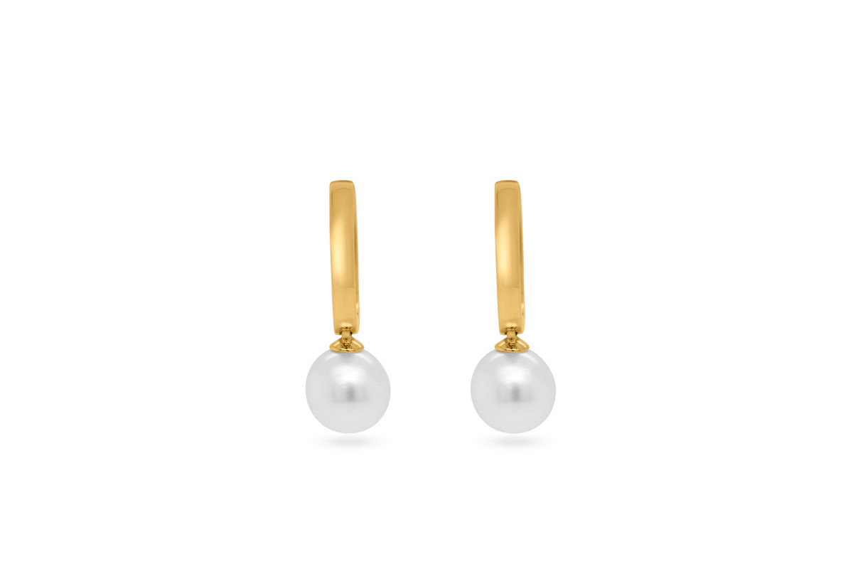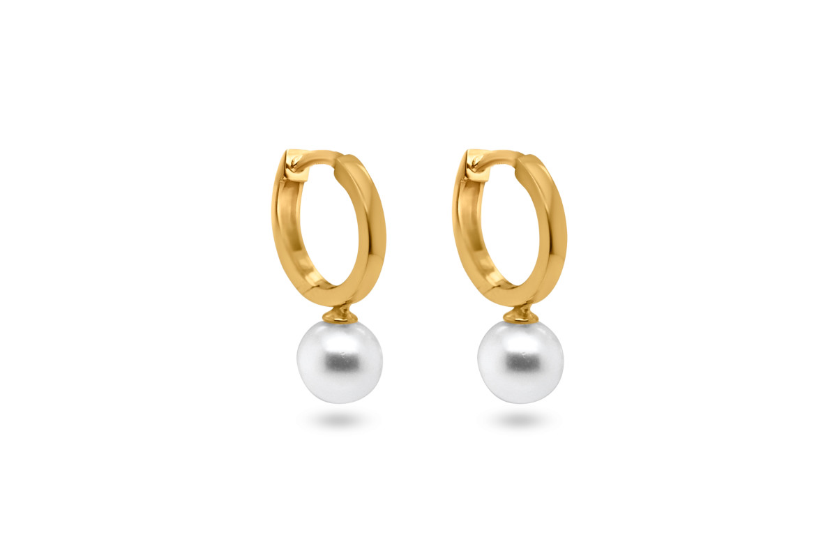 Creolen in 18kt geel goud die ongeveer 2mm breed zijn en 1.2cm lang. Onderaan de creool is er een witte ronde cultuurparel bevestigd, de parel is ongeveer 8mm.