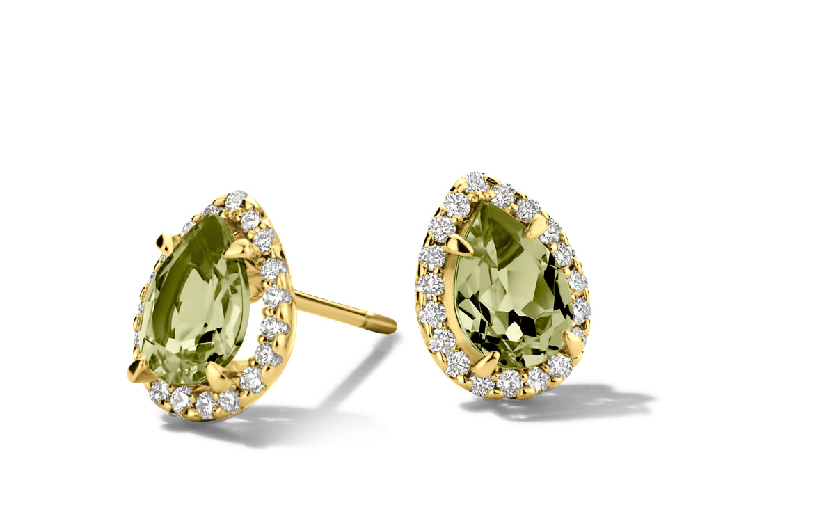 Prachtige oorknoppen in 18kt geel goud met een peervormige groene toermalijn en briljantjes errond. Ook de bijpassende hanger en ring zijn verkrijgbaar.