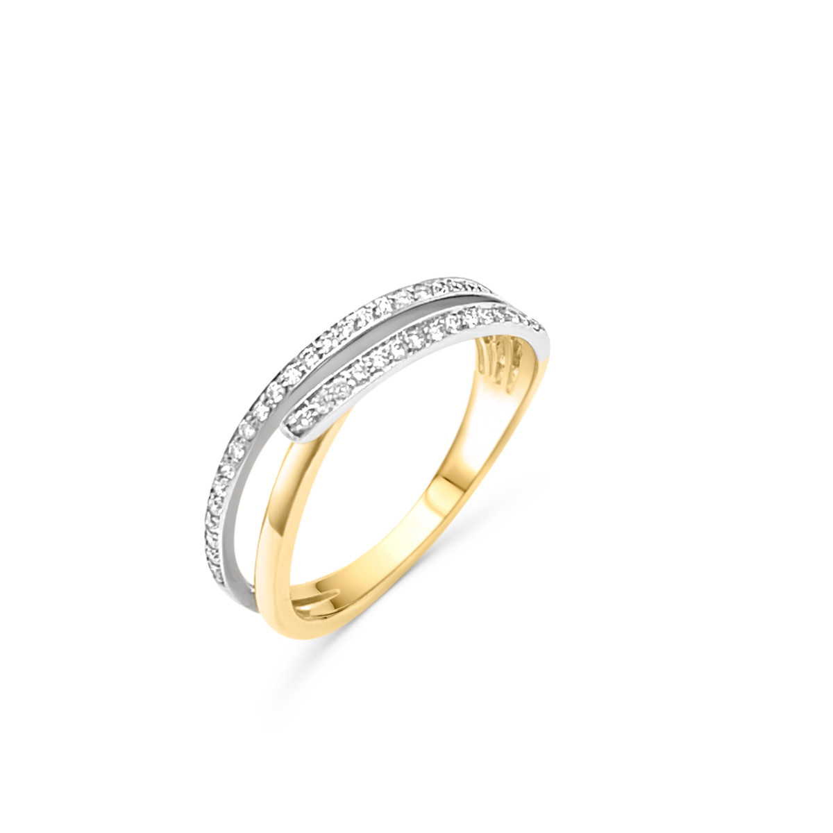 Crossover ring in 18kt wit en geel goud met briljant, de bestaat uit 3 banden waarvan er 2 bezet zijn met briljant. Elegant en zichtbaar op de vinger.