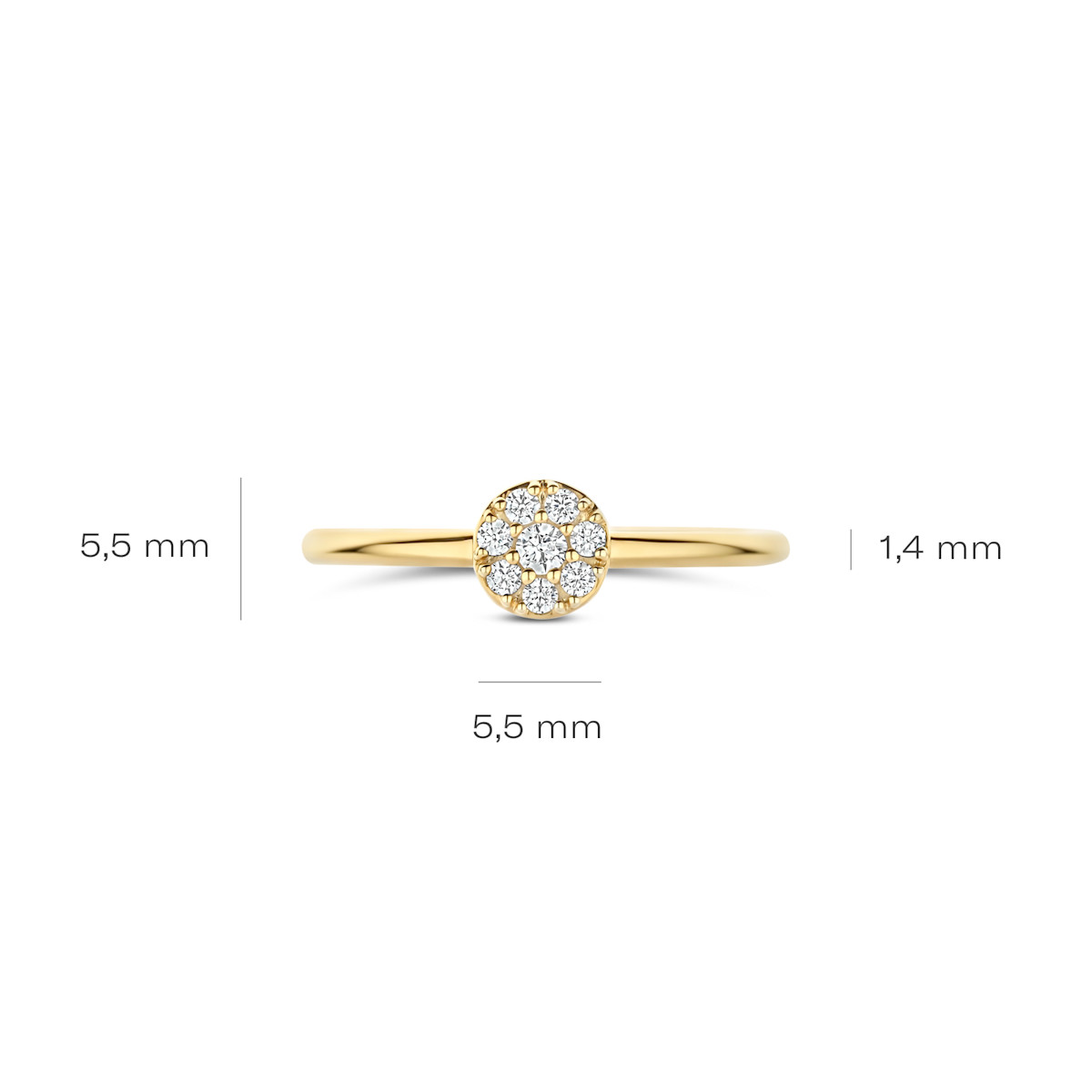 Ontdek deze verfijnde ring, vervaardigd uit 14k geelgoud. Je ziet een slanke band die subtiel overgaat in een cirkelvormig cluster van schitterende zirkonia's. Deze zijn zorgvuldig pavé gezet voor maximale glans. Met een banddikte van ? 1.4 mm draagt hij comfortabel en elegant. Een tijdloze toevoeging aan jouw sieradencollectie. Type goud: 14k Geel goud Type zetting: Pavé-zetting Type steen: Zirkonia Steenkleur: Helder Grootte detail/applique: ? 5,5 mm Diameter: ? 1.4 mm