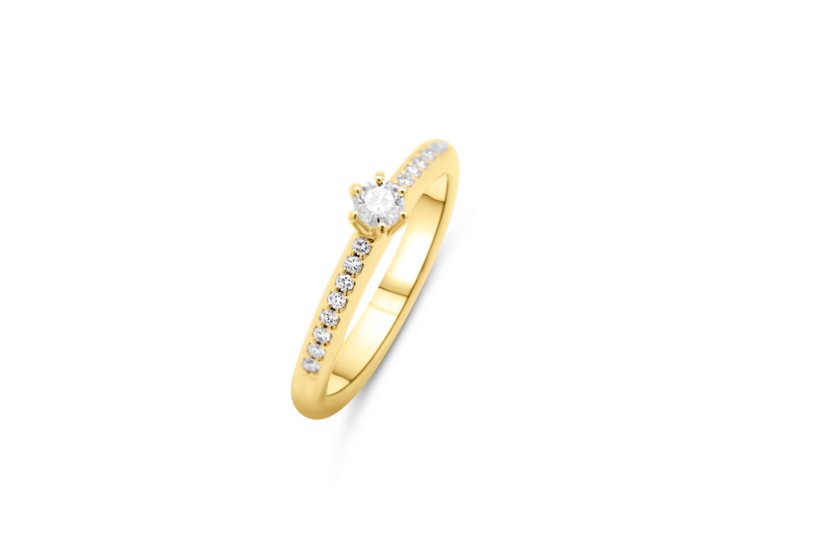 Solitair ring in 18 kt goud met briljant – verfijnde elegantie in een klassieke 6-griffenzetting Deze elegante solitair ring in 18 karaat goud belichaamt pure eenvoud en tijdloze klasse. In het midden schittert een briljant geslepen diamant, stevig en harmonieus gezet met 6 fijne griffen. Deze klassieke zetting omarmt de steen subtiel en laat het licht uit alle hoeken reflecteren, wat zorgt voor een prachtige schittering. Het ontwerp straalt een delicate balans uit tussen verfijning en stevigheid, met een smalle, elegante band die de centrale steen volledig laat spreken. Ideaal als verlovingsring of als bijzonder juweel dat een blijvende indruk nalaat. Een solitair zoals hij hoort te zijn – stijlvol, evenwichtig en voor altijd geliefd.
