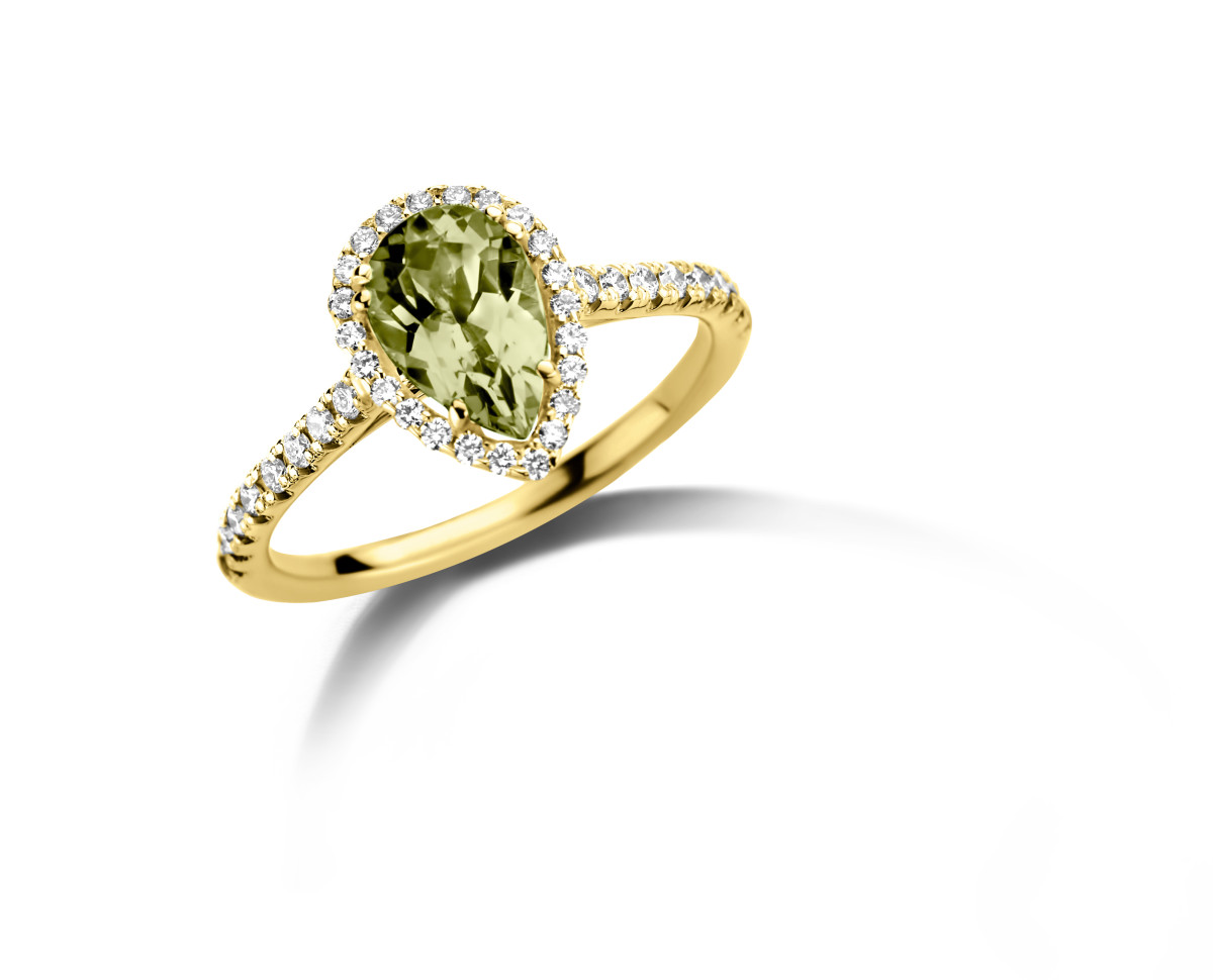 Prachtige ring in 18kt geel goud met briljant en een peervormige groene toermalijn omringd door briljant. Ook de bijpassende oorringen en hanger zijn verkrijgbaar.