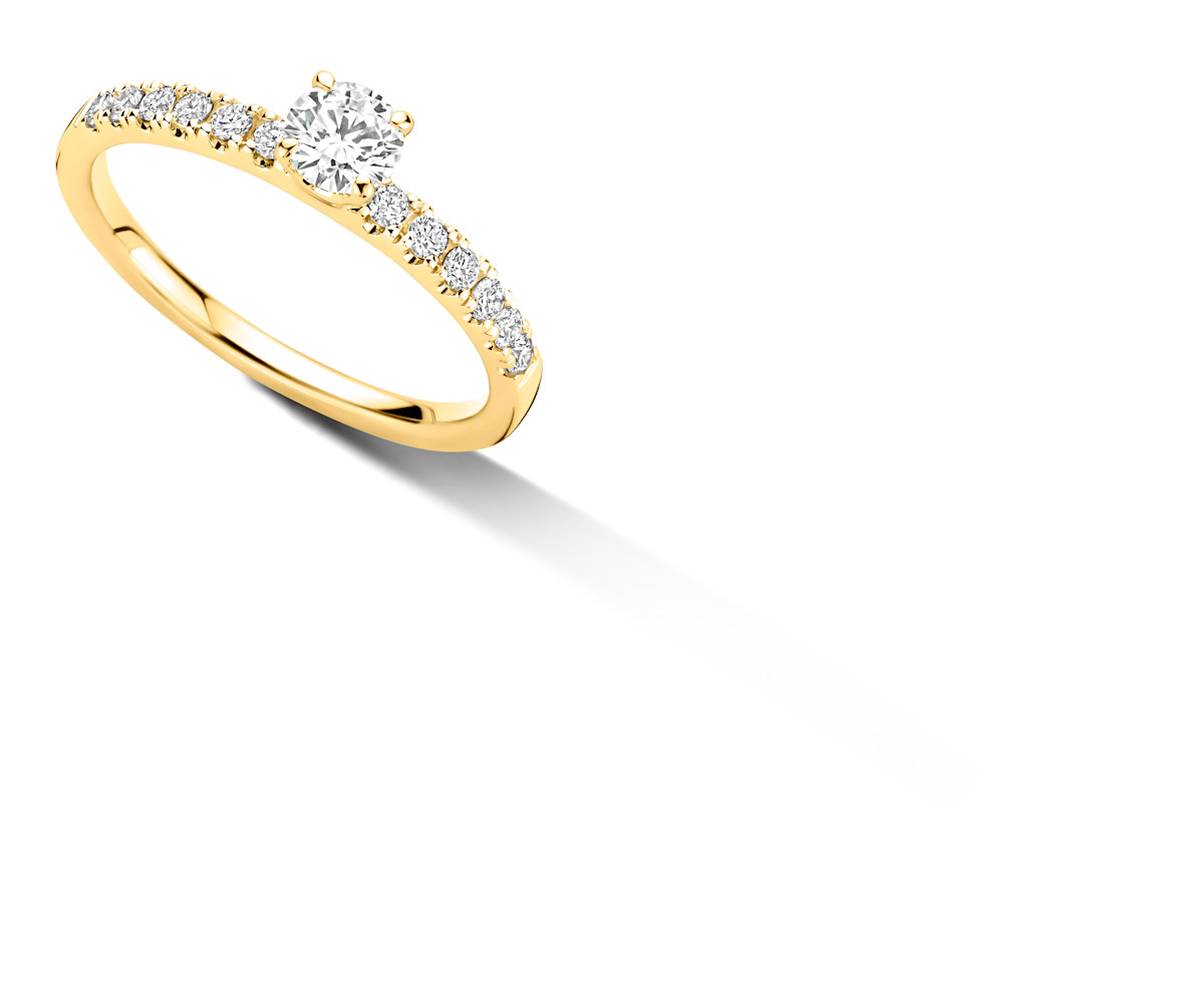 Solitair ring in 18 kt geel goud met briljant en pavé band – klassieke romantiek met extra schittering Deze prachtige solitair ring in 18 karaat geel goud is het toonbeeld van tijdloze elegantie. In het midden schittert een briljantgeslepen diamant, subtiel maar krachtig, gezet in een verfijnde kast die de steen maximaal laat stralen. Langs de band zijn kleine briljantjes pavé gezet, wat zorgt voor een extra fonkeling en een luxueuze uitstraling. Het warme geel goud vormt een perfecte combinatie met de zuivere schittering van de diamanten – een klassiek ontwerp met een eigentijdse touch. Een ring die liefde uitstraalt in elk detail – voor wie houdt van klassieke schoonheid met een fonkelende afwerking.
